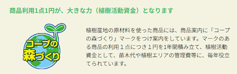 「コープの森づくり」マーク対象商品ご利用1点につき1円が山・川・海を守るための資金になります。